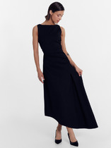 Перед и спинка цельные. Диагональные проймы окантованы бейкой из основного полотна. Окантовка пройм переходит в бретели.