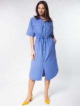 Платье женское прямого силуэта из трикотажного полотна селаник. Горловина круглой формы, с притачным воротником с отрезной стойкой из поплина и застежкой на пуговицу. Плечо слегка спущено, пройма углублена. Рукав втачной, длинный, по низу с отрезной манжетой из селаника. Платье длиной чуть выше колена.
