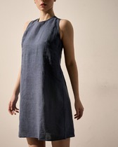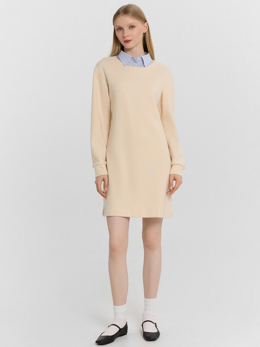 Платье женское прямого силуэта из  трикотажного полотна селаник. Горловина круглой формы, с  притачным воротником с отрезной стойкой из поплина и застежкой на пуговицу. Плечо слегка спущено, пройма углублена. Рукав втачной, длинный, по низу с отрезной манжетой из селаника. Платье длиной чуть выше колена.