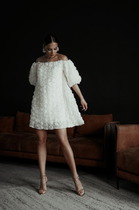 Платье отрезное по талии, низ платья из ткани присборен и к низу расширяется.