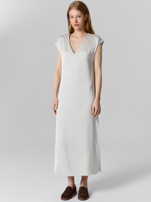 Платье женское прямое. Перед цельнокроеный, по спинке центральный шов. Горловина V-образная, обработана обтачкой из основного полотна. Рукава цельнокроеные. По бокам разрезы. Рукава и низ вподгибку.