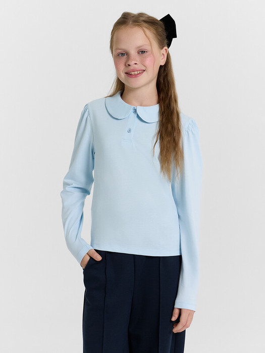 Поло для девочек полуприлегающего силуэта. С длинными рукавами. С воротником. По переду обработана застежка «поло» на 2 петли и пуговицы (d=10мм). Низ рукава и поло подложены на плоскошовке.