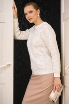 Рукав рубашечного кроя, длинный, широкий, на манжете из рибаны, шов притачивания манжеты расстрочен плоскошовкой (одна игла по рукаву, вторая по манжете). По низу джемпера--отрезной пояс из рибаны, шов притачивания расстрочен плоскошовкой.