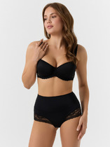 Трусы женские корректирующие с высокой посадкой, из эластичного кружева и трикотажного полотна микрофибры.  Верхние детали из микрофибры соединены между собой ширителем, нижние детали из кружева. Верхняя часть двойная, со сгибом по талии.  Подкладка ластовицы выполнена из кулирного полотна, отлетная по переднему краю. По срезам ластовицы жилка 6мм. внутри (WT4-6).