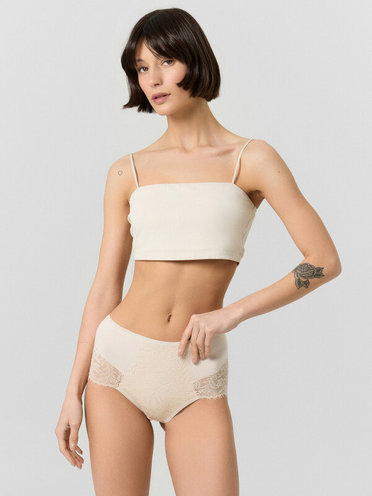 Трусы женские макси с высокой  посадкой из кулирного полотна и эластичного кружева. Перед с вертикальным и горизонтальным членением. Передняя центральная деталь из кулирного полотна с наложением наверх эластичного кружева. Ластовица отрезная на подкладке из основного полотна. Срезы ластовицы обработаны эл тесьмой 6 мм (жилка тканая Wt4-6, девсел 13460 W) с наложением на лицевую сторону полотна и с узким верхним застилом в край. Задняя деталь со средним швом и с горизонтальным членением. Вертикальные и горизонтальные швы собраны на ширителе. Верхний срез обработан эластичной тесьмой 10 мм (жилка тканая Wt4-10, девсел 13460 W) с наложением на лицевую сторону полотна и с узким верхним застилом в край.