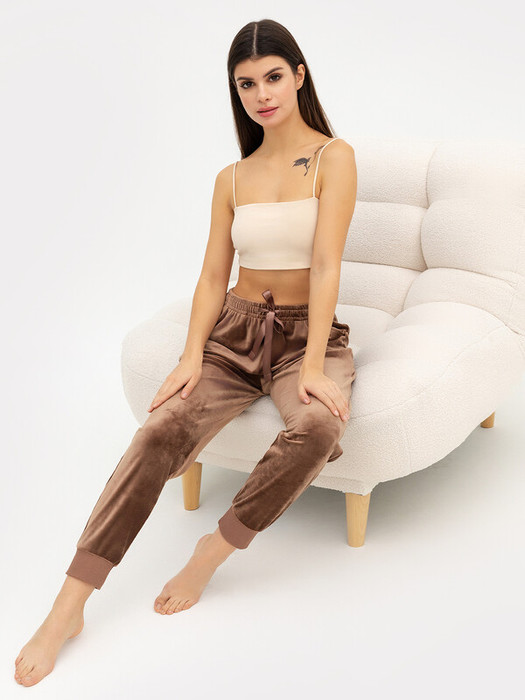 Брюки из нежного трикотажного флиса. Длина классическая, силуэт свободный, немного сужается к низу. Штанины завершаются манжетами из рибаны. Пояс с резиной и бархатным регулировочным шнурком. Есть функциональные карманы. Отличный выбор!