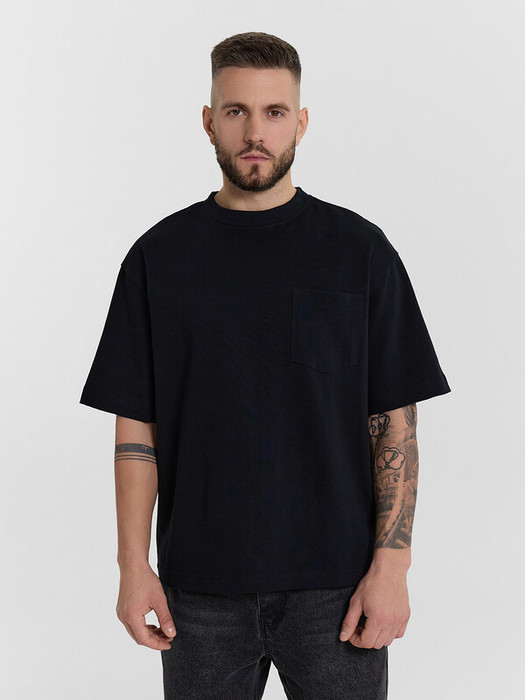 Футболка свободная укороченная, оверсайз. Горловина округлой формы обработана обтачкой из рибаны. Рукава втачные, корткие. Линия плеча спущена. На детали переда накладной карман (мод 111899-1). Нижние срезы футболки и рукавов обработаны швом вподгибку.