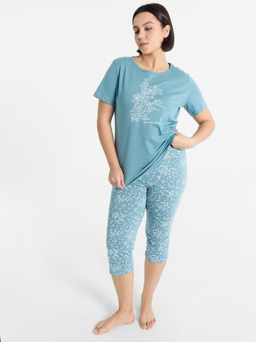 Стильная пижама женская с бриджами прямого кроя и джемпером с коротким рукавом изготовлена из высококачественного мягкого хлопка. Пижама выполнена с рисунком в виде надписи. Красивый насыщенный цвет и оригинальный рисунок делают пижамку интересной и привлекательной. Пижама с бриджами — отличный вариант женской одежды для сна, домашних дел, а также для отдыха дома. Мягкий, эластичный хлопковый материал гипоаллергенен, подойдет для нежной кожи. В линейке много интересных расцветок, широкий размерный ряд, есть актуальные модели plus-size пижам женских для девушек с пышными формами. Домашний комплект с бриджами от Mark Formelle приятно получить как подарок на праздники, так и без повода!