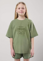 Трикотажная майка, декорированная ярким принтом деталями из пайеток. Свободный крой, круглый вырез горловины, спинка "борцовка".На ребенке представлен размер 110:- Ширина изделия по линии груди 29,5 см- Ширина по низу изделия 41 см- Длина изделия 40,4 смРазница между размерами составляет 1,5 см.
