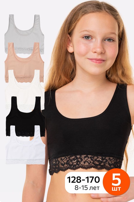 Нежность и забота в каждой нити! Набор детских топов из 5 штук для девочек и девочек-подростков выполнен из приятного к телу хлопка. Легкая ткань отлично пропускает воздух, позволяет коже дышать и делает топики для детей незаметными под школьной формой. Топы на широких бретелях представлены в классических цветах и украшены нежным кружевом.