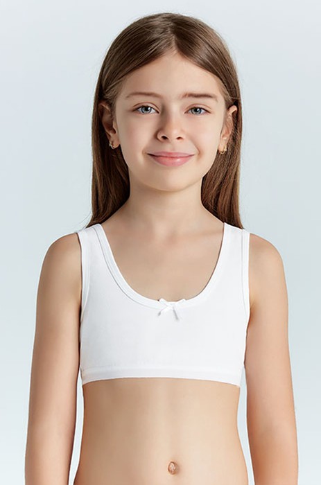 Бельевой топ сшит из трикотажного хлопка, который подойдет даже для самых чувствительных детей. Все швы подросткового бюстгальтера гладкие и не будут беспокоить ребенка во время активных занятий, в проймах мягкие эластичные бейки. Благодаря небольшому добавлению эластана топик хорошо тянется, отлично сидит по фигуре. Белый бюстик сохранит первоначальные свойства даже после многочисленных стирок.
