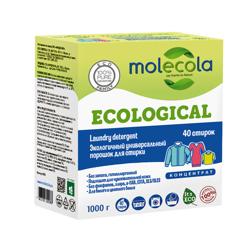 Стиральный порошок Molecola для белого белья с растительными энзимами эффектно ликвидирует даже устойчивые застрявшие следы и качественно отбеливает материалы. Не имеет в составе вредоносных веществ и не раздражает кожу.