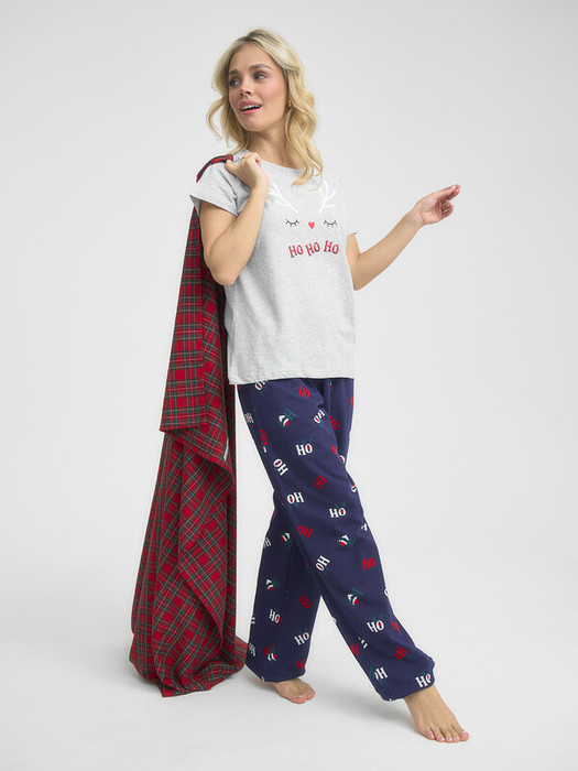 Трикотажная пижама с Новогодней тематикой. Серая футболка свободного кроя длиной до бердра украшена принтом рожки, глазки и носик оленя и надписью "Ho Ho Ho" . Брюки на резинке, свободного кроя, темно-синего цвета в белые и красные принтованые слоги "HO" .