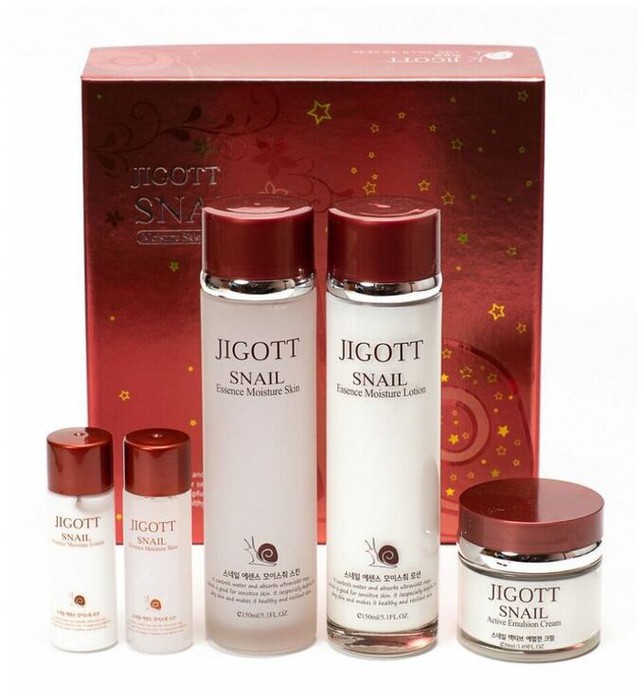 В набор для комплексного ухода за кожей лица на основе экстракта улитки Snail Moisture Skin Care Jigott входят продукты популярной улиточной серии в полноценном и миниатюрном исполнении (для поездок):