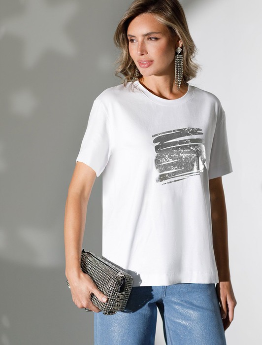 Совместные покупки Курган Женская одежда Джемперы, свитеры, водолазки — Нарядная футболка с принтом фольгой из премиального хлопка с эластаном