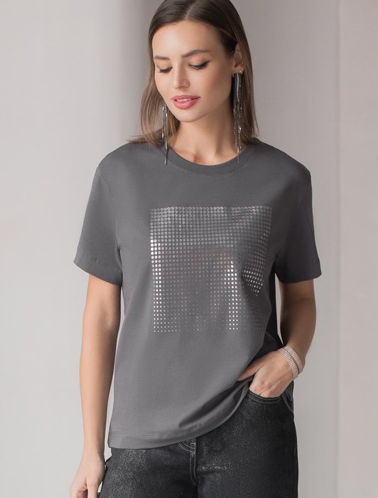Состав: 92%Хлопок 8%ПУ Плотность: 170 Г/м2Стильная базовая футболка темно-серого цвета с серебристым принтом фольгой выполнена из плотного хлопка с эластаном для комфортной посадки на любую фигуру. Прямая футболка классического кроя с круглым вырезом, прекрасно подходит для разных типов фигуры, в том числе и на большие размеры. Мягкость хлопка вместе с небольшой долей эластана гарантирует идеальную посадку и свободу движений. Легкая натуральная дышащая ткань премиального качества делает футболку с коротким рукавом идеальным вариантом для повседневной носки дома, на работу или офис. Однотонная футболка дополнена авторским аккуратным принтом с минималистичной надписью, который придает праздничный и элегантный вид без лишней вычурности. Блестящий принт аккуратно украшает, добавляя изысканный акцент и создавая легкий мерцающий эффект.