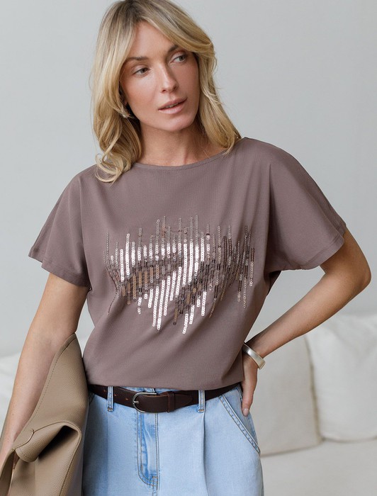 Состав: 92%Хлопок 8%ПУ Плотность: 150 Г/м2Футболка кофейного цвета идеально подходит для вечеринки и создания яркого образа. Оригинальный принт из блестящих пайеток в виде дождика придает изделию шикарный вид, который привлечет внимание на любом мероприятии. Модель с вырезом лодочка и цельнокроеным рукавом обеспечивает свободу движений и комфорт в носке. Такой фасон изделия подходит на большие размеры, гармонично сидит на фигуре и помогает создать легкий акцент на достоинствах. Благодаря особенностям кроя с цельнокроеным рукавом удается искусно скроет любые возможные недостатки в области плеч и рук, обеспечивая комфортное прилегание без ощущения скованности. Аккуратный вырез лодочка красиво подчеркивает шею и делает образ элегантным, сохраняя актуальность для разных случаев — от рабочих встреч до вечерних прогулок и праздничных мероприятий.