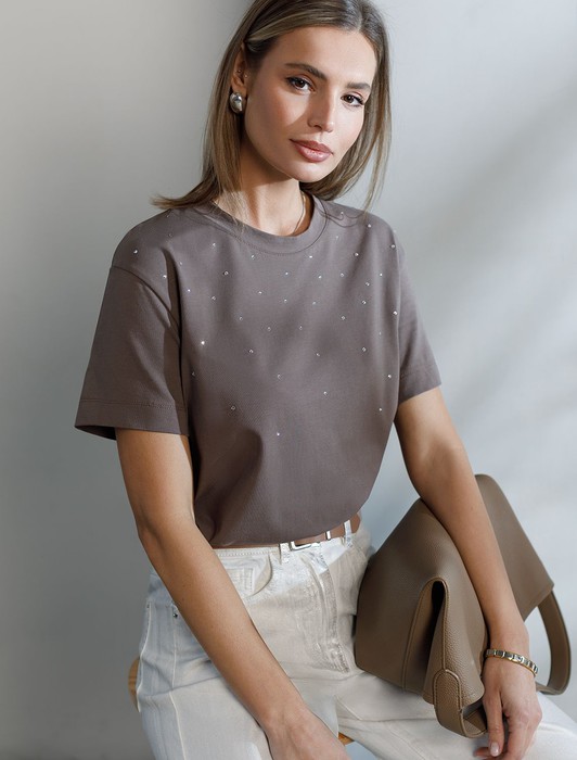 Состав: 92%Хлопок 8%ПУ Плотность: 170 Г/м2Стильная базовая футболка кофейного цвета с принтом стразами выполнена из плотного хлопка с эластаном для комфортной посадки на любую фигуру. Прямая футболка классического кроя с круглым вырезом, прекрасно подходит для разных типов фигуры, в том числе и на большие размеры. Мягкость хлопка вместе с небольшой долей эластана гарантирует идеальную посадку и свободу движений. Легкая натуральная дышащая ткань премиального качества делает футболку с коротким рукавом идеальным вариантом для повседневной носки дома, на работу или офис. Однотонная футболка дополнена авторским аккуратным принтом, который придает праздничный и элегантный вид без лишней вычурности. Блестящий принт в виде россыпи страз аккуратно украшает, добавляя изысканный акцент и создавая легкий мерцающий эффект.