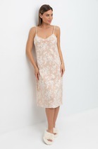 Сорочка женская из трикотажного полотна «кулирка» с набивным рисунком, расширенная книзу, без рукавов, с расширенной, углубленной горловиной овальной формы и притачной кокеткой по переду. Срезы пройм и горловины, а также шов притачивания кокетки, обработаны фасонной эластичной тесьмой с кружевным краем. Низ изделия обработан узкой обметочной строчкой.