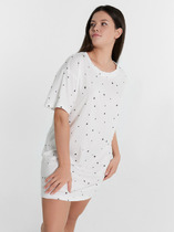 Сорочка женская из трикотажного полотна «кулирка» с набивным рисунком, расширенная книзу, без рукавов, с расширенной, углубленной горловиной овальной формы и притачной кокеткой по переду. Срезы пройм и горловины, а также шов притачивания кокетки, обработаны фасонной эластичной тесьмой с кружевным краем. Низ изделия обработан узкой обметочной строчкой.