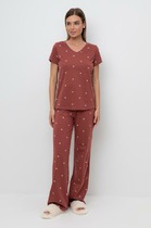 Сорочка женская из трикотажного полотна «кулирка» с набивным рисунком, расширенная книзу, без рукавов, с расширенной, углубленной горловиной овальной формы и притачной кокеткой по переду. Срезы пройм и горловины, а также шов притачивания кокетки, обработаны фасонной эластичной тесьмой с кружевным краем. Низ изделия обработан узкой обметочной строчкой.