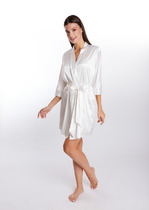 Сорочка женская из гладкокрашенного вискозного полотна, полуприлегающего силуэта, средней длины, без рукавов на широких бретелях, с разрезами в боковых швах. На полочке горловина овальной формы переходит в V-образный углубленный вырез на спинке, отделанный кружевом. Декоративным элементом является имитация «шнуровки» в виде перекрещенных между собой четырех шнурков, вытачанных из окантовки и прикрепленных к кружеву на спинке. Низ изделия и разрезы обработаны узкой обметочной строчкой, создающей волнистый край.