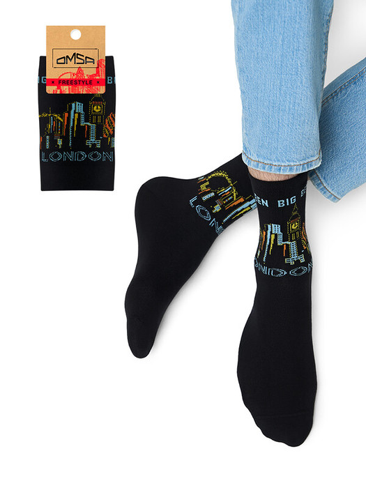 Носки унисекс OMSA с модным рисунком в виде знаковых городов мира. В составе - высококачественный хлопок, который позволяет коже дышать, отлично впитывает влагу и подходит даже для самой чувствительной кожи, и эластан, который обеспечивает превосходное облегание. Удобная широкая резинка и кеттельный (плоский) шов на мыске создают дополнительный комфорт.