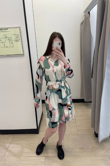 Платье свободного силуэта из плательной ткани. Изделие отрезное по линии талии, с ярусом на юбке. Лиф с застёжкой на пуговицы. Вырез горловины обработан отложным воротником на стойке. Втачной рукав на манжете с застёжкой на пуговицы. В комплекте пояс из основной ткани. В таблице размеров представлены параметры человека, а не изделия.