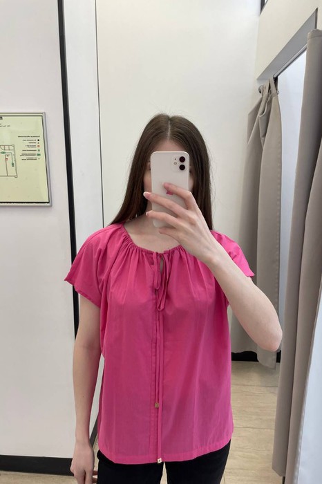 Блуза свободного силуэта из хлопковой ткани. Низ изделия с разрезами по бокам. Цельнокроеный короткий рукав. По центру передней части изделия выполнен шов с декоративной отстрочкой. По горловине сборка на изящные завязки с металлическими наконечниками.