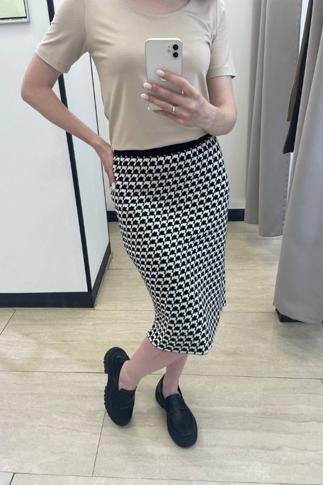Юбка прилегающего силуэта с эластичным поясом. Изделие выполнено из мягкой структурированной пряжи.