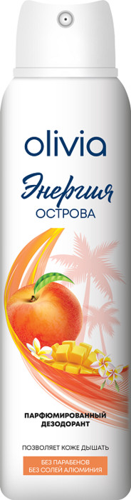 Представляем Вам новую линию парфюмированных женских дезодорантов Olivia с приятными ароматами, которые подарят ощущение комфорта и уверенности на весь день. Манящие ноты дезодоранта помогут раскрыть Вашу чувственность и изысканный стиль. Позволяют коже дышать. Без парабенов и солей алюминия. Надежно защищают от неприятного запаха до 48ч. Не оставляют следов на одежде. Энергия острова - аромат манго и персика.