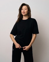 Футболка свободного силуэта. Спущенное плечо. Горловина из двух деталей, из рибаны.