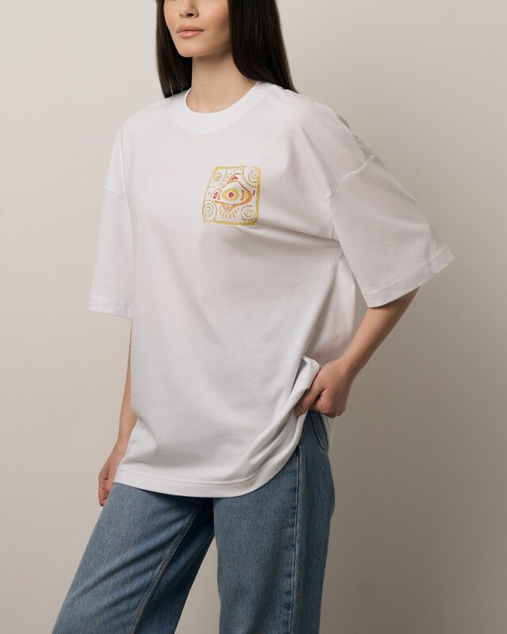 Футболка свободного силуэта. Спущенное плечо. Горловина из двух деталей, из рибаны.