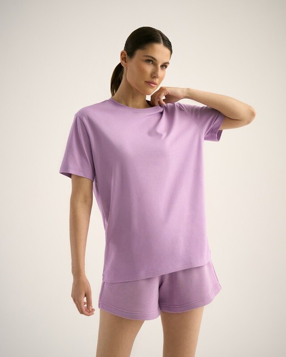 Boyfriend крой, укрепление по горловине спинки, круглый вырез. Горловина рибана. Отстрочка по горловине переда