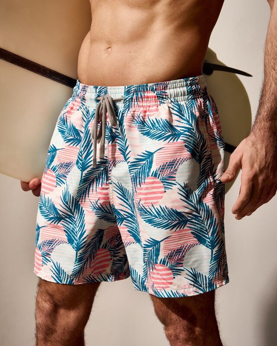 Плавательные шорты. Карманы в боковых швах. Задний карман с клапаном на правой задней половинке шорт. Пояс цельнокроенный, отстроченный, внутри с резинкой и шнурком.