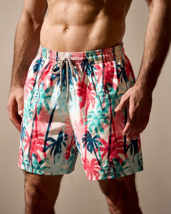 Плавательные шорты. Карманы в боковых швах. Задний карман с клапаном на правой задней половинке шорт. Пояс цельнокроенный, отстроченный, внутри с резинкой и шнурком.