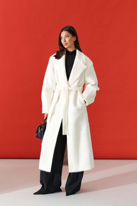 Полупальто прямого кроя выполнено из фактурного полотна молочного цвета. Характеристики: есть подклад, рукав втачной, воротник пиджачного типа, в боковых швах карманы. Спинка со средним шыом заканчивается шлицей, застёжка центральная на петли и пуговицы, пояс выполнен из основной ткани изделия.