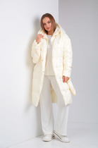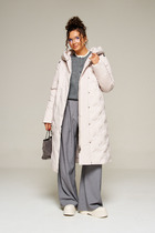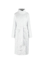 Утепленное стеганое пальто полуприлегающего силуэта-настоящий подарок для любителей классики. Изделие отрезное под линией груди с центральной застежкой на потайные кнопки. По низу рукава и по внутренней части воротника-стойки отделочная ткань светло-серого цвета. Низ рукава со шлицей на потайные кнопки. Утеплитель холкон (см.описание), плотность 100.