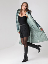Стеганое женское пальто с капюшоном отличается легкостью и практичностью. Значительное количество равномерных швов позволяет не только равномерно распределить утеплитель, но и уменьшить его пухлость.Пальто позволит создать прекрасный утонченный женственный образ, в отличие от других пальто из толстой ткани. Центральная застежка на молнию, карманы-листочки. В комплекте съемный завязывающийся пояс. Капюшон отстегивается. Утеплитель холкон (см.описание), плотность 100.