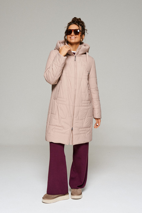 Пальто выполнено из стёганной, достаточно прочной и приятной на ощупь влагостойкой, полиэфирной ткани; на синтетической подкладке. Лёгкий утеплитель из холлофайбера 150 г/м.кв.; подходит для холодной осени и весны. Изделие рассчитано на температурный режим от +5 до -10 градусов.