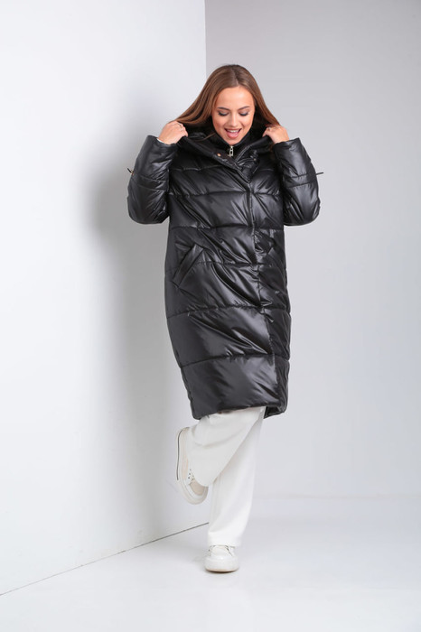 пальто женское с центральной застёжкой на кнопки. Линия плеча спущенная, рукав втачной одношовный с кулисой по низу. По переду прорезные карманы с листочкой с втачными краями. Капюшон цельнокроенный с центральной частью. В качестве отделки испоьзуются детали. Варежки съёмные манишка с центральной с центральной застёжкой на тесьму-молнию(втачная деталь).