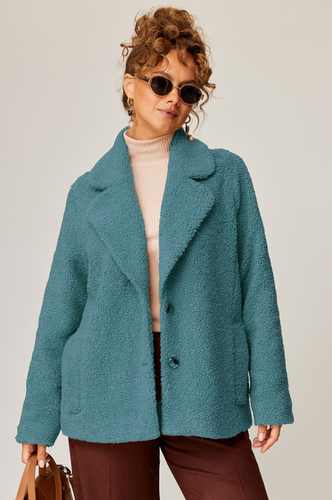 Куртка свободного силуэта выполнен из пальтовой ткани "Барашек". Воротник пиджачного типа с закругленными концами. Застежка на две петли и пуговицы. Перед с рельефными швами, в которых обработаны карманы с листочками с настрочными концами. Рукав втачной двухшовный. Куртка на подкладке. Длина куртка - 67 см, длина рукава - 62 см.
