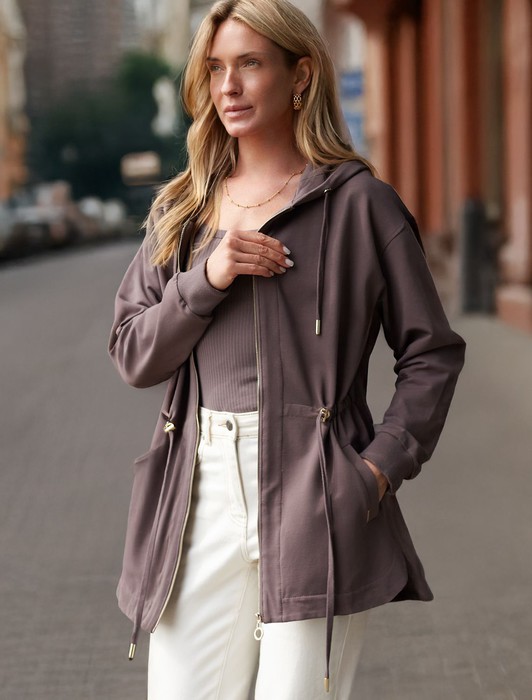 Состав: 95%Хлопок 5%ПУ Плотность: 240 Г/м2 Параметры модели на первом фото: Рост 170, бюст 89, талия 63, бедра 92 Размер товара на первом фото: 42Парка выполнена из эластичного футера двухнитки. Модель дополнена золотистой фурнитурой высокого качества с логотипом бренда. Как у классической модели, изделие с капюшоном, боковыми карманами и регулируемым поясом на хлопковом шнурке. Сочетается в костюме с брюками D44.136, D44.137 и юбкой D46.034