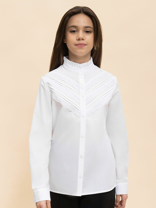 Блузка классическая полуприлегающего силуэта с рельефами на спинке для девочки. Школьная блузка не сковывает движений ребёнка. Перед украшают застроченные по диагонали защипы и тонкое изящное кружево — нежные винтажные мотивы. Модель дополнена длинными рукавами небольшого объема на манжете с застежкой. Аккуратный изящный воротник-стойка с кружевом придаёт изделию изюминку и женственность. В составе ткани преобладает высококачественный хлопок, обеспечивающий отличную воздухопроницаемость и комфорт. Благодаря полиэстеру блузка в школу для девочки прекрасно сохраняет форму и первозданный внешний вид даже после многократных стирок. Для школьных рубашек мы используем сорочечную ткань, плотностью 100гр/м2. Модель однотонная, без принта. Блузка белая для девочки — это универсальный вариант, который легко сочетается с различными брюками, юбками и сарафанами, позволяя создавать разнообразные образы для разных случаев. Блузка детская — отличный выбор школьной формы для вашей девочки. Помните о правильном уходе за изделием: рекомендуется стирать при температуре не выше 30 °C, без предварительного замачивания, с изнанки. Это поможет сохранить качество и цвет блузки на долгое время.