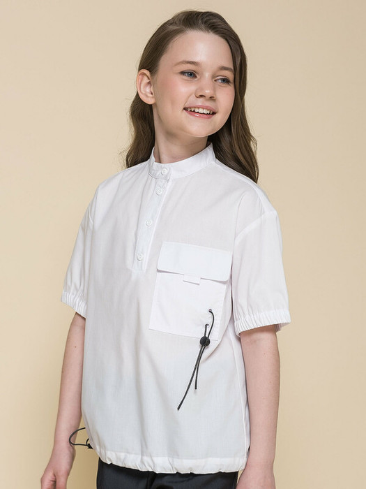 Школьная блузка для девочки. В составе ткани преобладает хлопок — изделие мягкое, дышащее и комфортное. Полиэстер помогает не терять форму и отличный внешний вид. Объемный крой, спущенное плечо – настоящий трендовый оверсайз. Модель с воротником-стойкой застёгивается на пуговицы по переду — ребёнку удобно надевать и снимать блузку через голову. По переду накладной карман с клапаном, который украшает эластичный световозвращающий шнур со стоппером — модно и актуально. В манжетах рукавов широкая внутренняя резинка — не давит и не впивается. По низу внутренний эластичный световозвращающий шнур со стоппером — можно регулировать объём и менять силуэт. На девочках с разными фигурами будет смотреться идеально. Удобно в течение всего дня. Отличный вариант блузки для школы. Идеально белый цвет без желтого и серого оттенка.