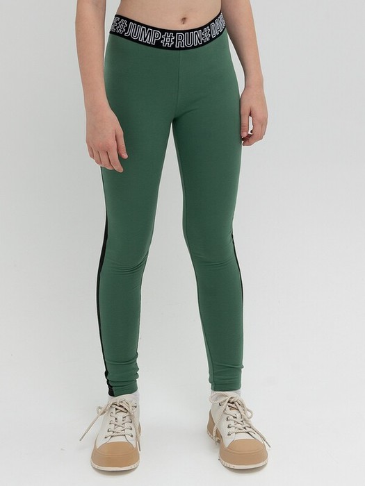 Трикотажные лосины для девочек со средней посадкой. Леггинсы сшиты из ткани с высоким содержанием хлопка, которая приятна на ощупь и комфортна в ношении. Благодаря добавлению эластана леггинсы идеально облегают ноги, хорошо тянутся и не сковывают движение. Вставки из ткани контрастного цвета делают ноги еще стройнее. Пояс из широкого тканого эластика с текстом "танцуй, прыгай, бегай" не сдавливает живот, не закатывается и не врезается. Идеальны для занятий спортом в комбинации с кроп-топом, на улицу и для дома с удлиненными футболками и худи.