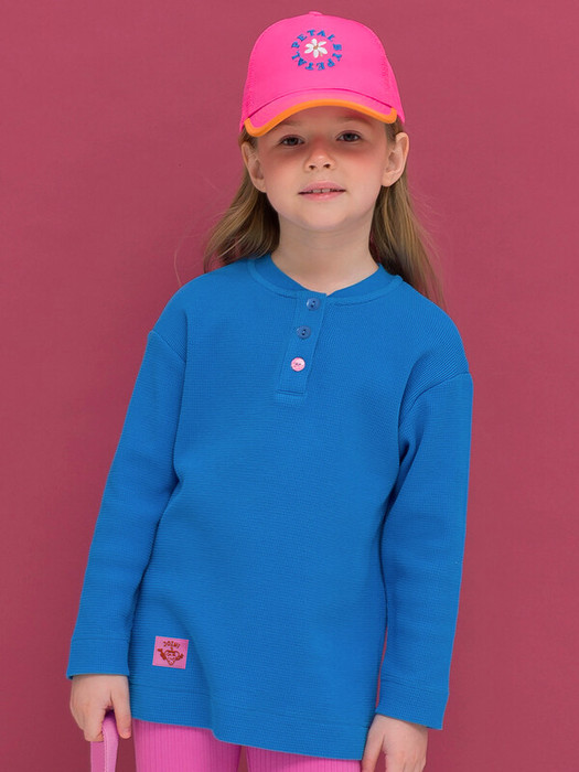 Лонгслив-хенли для девочек. Приятный на ощупь, с большим содержанием хлопка (95%) в составе, гигроскопичный и простой в уходе вафельный трикотаж. Свободный силуэт со спущенным плечом. Воротничок из рибаны – не давит, эластичный. Планка у горловины на пуговицах, нижняя пуговица в розовую клетку – оригинальная фишка модели. Широкая подгибка рукавов и низа – актуальный тренд на увеличенные отделочные детали кроя. Миниатюрная силиконовая нашивка с выпуклыми буквами – тактильно приятная изюминка. Лонгслив подходит на каждый день, для активного образа жизни, идеален для пляжного сезона.