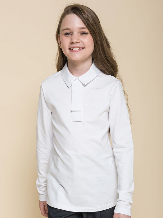 Школьный трикотажный джемпер прилегающего силуэта для девочки. В составе ткани преобладает хлопок — изделие мягкое, дышащее и приятное на ощупь. Эластан помогает сохранять форму и после многочисленных стирок. В джемпере комфортно в течение всего дня, ничего не давит, не колет, не сковывает движения.  Блузку украшают белый воротничок и декоративно сложенный галстук из швейной ткани с пуговицей в тон — изюминка этой модели. Он позволяет создавать элегантные образы с пиджаком, жилетом, сарафаном. Модель застёгивается сзади на пуговицу с петлёй из резинки — ребёнку удобно её застёгивать и расстёгивать. Универсальный вариант школьной одежды — подойдёт как для повседневной носки, так и для более торжественного случая.