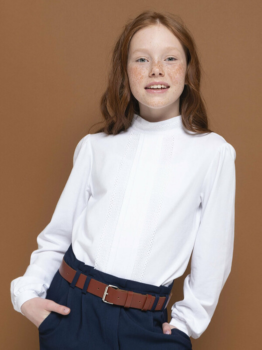 Кружево по бокам центральной складки спереди и по воротнику, а также лёгкая сборка рукава вносят немного романтики в классический стиль блузки.