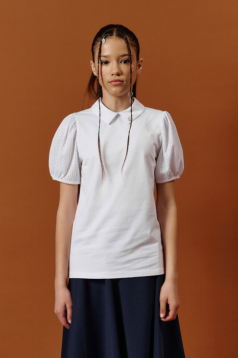 Короткие рукава из лёгкого гофрированного кружева добавляют лёгкости и нежности образу, а аккуратная сборка по плечам и низу рукавов делает их воздушными и стильными. Воротник создаёт аккуратный и опрятный вид — идеально для школьного дресс-кода.